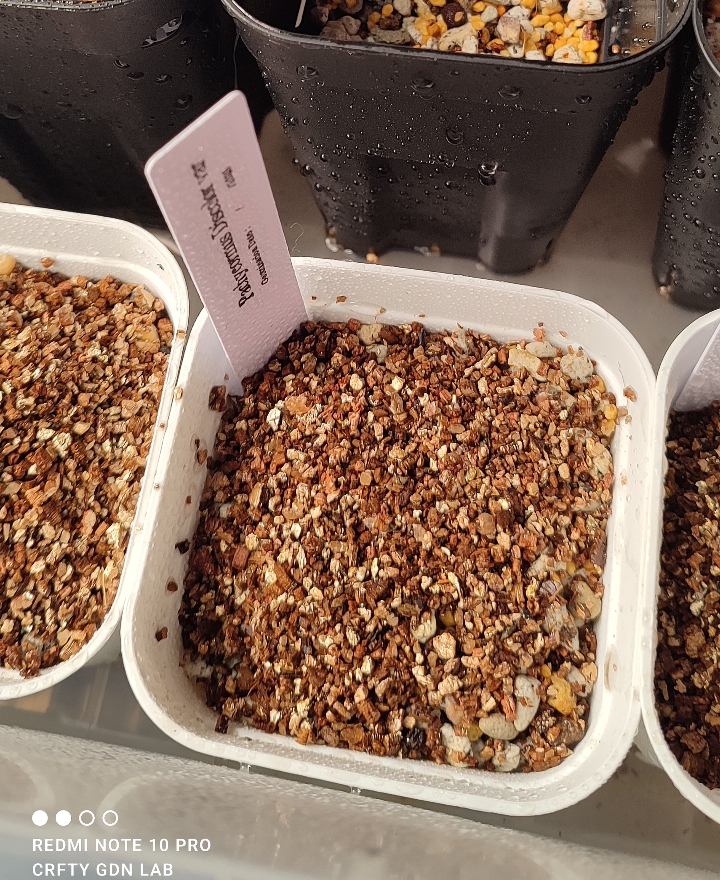 以下の分量で用土を配合し、育成環境の温度に温めます。用土はそれぞれをザルでふるって微塵を取り除くと良いです。ポッドに用土を入れてから水をたっぷりかけて、さらに微塵を取り除きます。